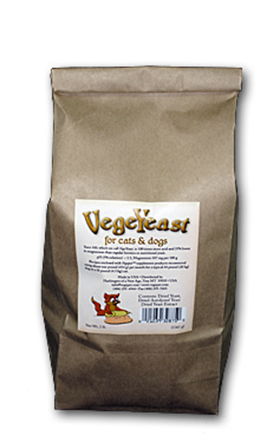 Vegepet recipes require about 1 pound (454 grams) of yeast per month for a 10 pound (4.5 kg) cat or a 44 pound (20 kg) dog.
