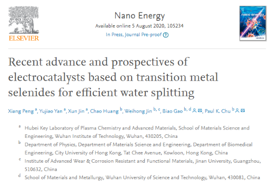 (通讯员:严宇娇)近日,公司特聘教授彭祥博士指导课题组研究生系统综述了过渡金属硒化物电解水催化剂的最新研究进展,涵盖多种过渡金属硒化物体系,重点涉及其物理性质,合成方法,催化活性分析和性能调控策略,并对该领域的发展作出总结和展望。相关成果以“Recent Advance and Prospectives of Electrocatalysts Based on Transition Metal Selenides for Efficient Water Splitting”为题发表在能源领域顶级期刊Nano Energy(IF:16.602)上,公司等离子体化学与新材料湖北省重点实验室为该论文的第一单位。
