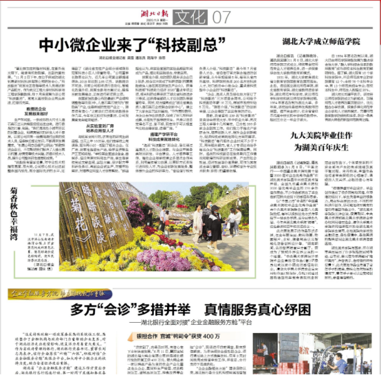 (通讯员:文静)11月9日,《湖北日报》文化专栏以《中小微企业来了“科技副总”》为题报道了公司姚军龙副教授作为湖北钊晟新材料科技有限公司研发中心“科技副总”服务企业的先进事迹。