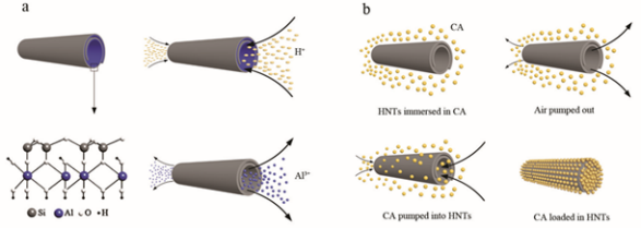图1.酸处理后的埃洛石纳米管和埃洛石纳米管封装香芹酚的示意图