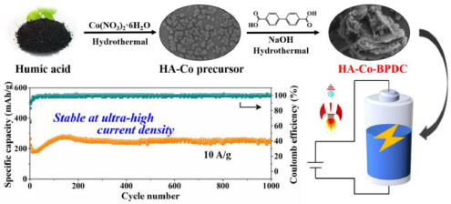 团队进一步以生物质废弃物的组分腐殖酸为原料,构筑了一种具有交联结构的金属有机框架(MOF)材料。利用腐殖酸丰富的含氧官能团及4,4'-联苯二甲酸(BPDC)与金属中心原子强的配位作用,促进交联结构的形成,从而提高电极材料的对体积膨胀/收缩的耐受性,并获得优异的循环稳定性。该材料在用作锂离子电池的负极时,表现出极好倍率性能及循环稳定性,在5 A g-1和10 A g-1的超高电流密度下经1000次循环后比容量高达315 和242 mAh g-1 (对应于84%和80%的高容量保持率),高于目前所报道的大多数基于MOF的电极材料。该工作发表于电化学领域知名期刊Electrochimica Acta上。