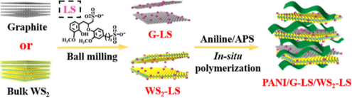 此外,团队通过在导电聚合物中引入一维和/或二维纳米材料,实现了聚合物三维孔隙结构的构筑,所制备的导电聚合物/纳米功能材料复合物,在用作超级电容器电极材料时,表现出极好电化学性能,相关工作前期发表于Applied Surface Science, 2022, 593, 153457 (IF:7.392),Journal of Energy Storage, 2021, 40, 102695 (IF:8.907)。 在此基础上,团队近期开发了一种通过二维层状范德华异质结(G-LS/WS2-LS)提高聚苯胺(PANI)电化学性能的方法。得益于石墨烯良好的导电性和化学稳定性,以及WS2的高氧化还原活性,所制备的三元纳米复合电极PANI/G-LS/WS2-LS与PANI相比,超级电容性能得到显著增强。相关成果发表在Energy & Fuels上。
