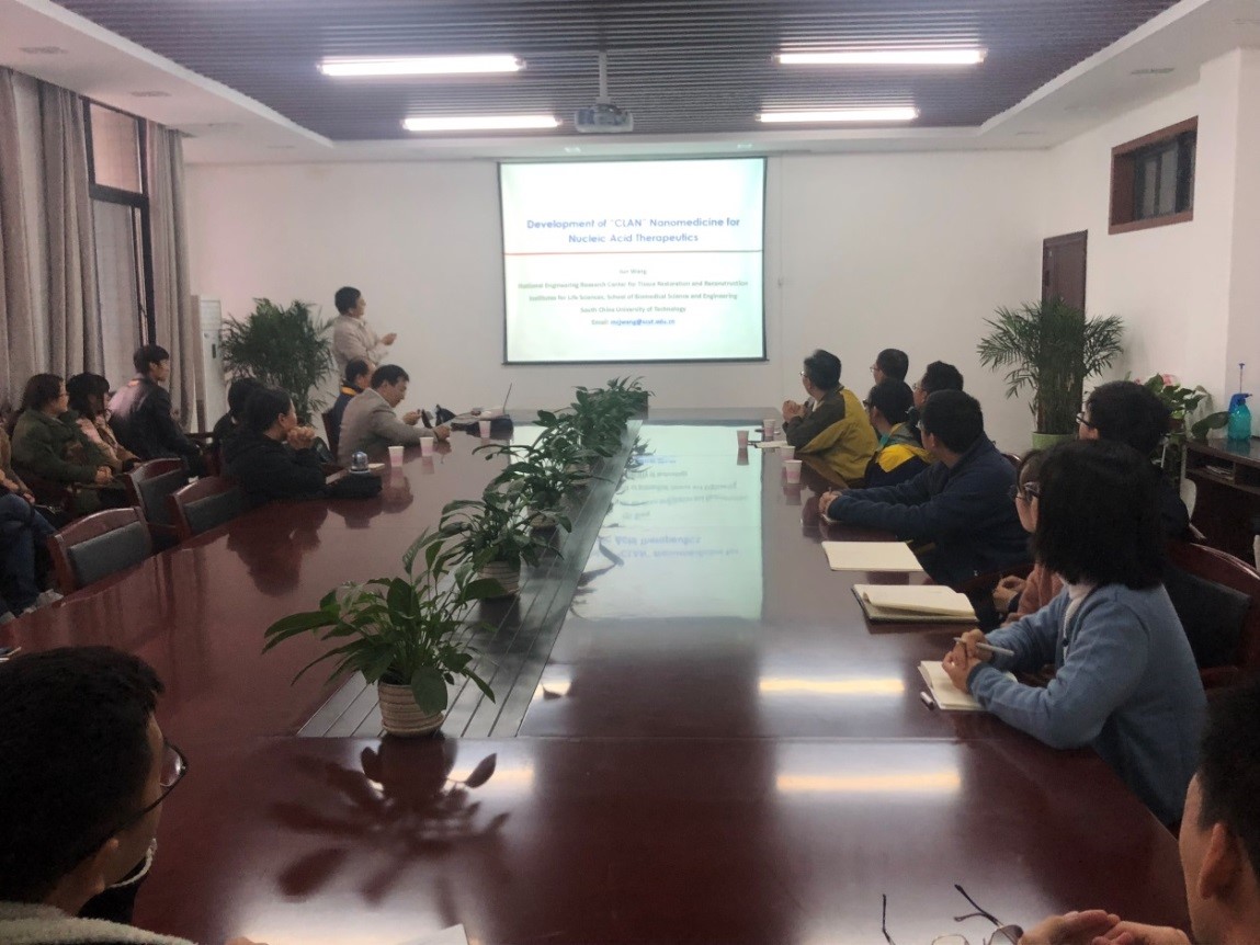 王均教授从纳米颗粒作为药物递送系统出发,分别介绍了研究团队在核酸纳米递送体系在相关基因缺陷基本和免疫相关疾病方面的研究情况。王教授的报告思路清晰、图文并茂、引人入胜,从科研数据扩展到临床应用,丝丝入扣。报告期间,王教授反复强调生物医用材料的研究安全评价是重中之重,只有保障安全性才能实现其推广应用。到场师生都认真聆听,并沉浸在核酸纳米递送体系及生物医用材料广阔的知识海洋里。
