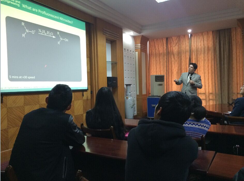 本网讯(通讯员 鄢国平)近日,应公司外事处、国际学院、MK SPORTS邀请,澳大利亚昆士兰科技大学化学、物理与机械工程学院James Blinco副教授来公司进行2天的访问。James Blinco博士在武昌校区电教中心九楼会议室为公司师生作了题为“Synthesis and Design of Profluorescent Nitroxide- Based Sensor Materials”的学术报告。报告会由MK SPORTS鄢国平教授、张桥博士共同主持,公司100余名师生到场聆听了此次学术报告。James Blinco博士在报告中主要介绍了他的课题组在氧化氮自由基材料的研究与应用等方面的工作情况。整场报告生动活波,兴趣盎然、使到会师生受益匪浅。报告结束后,James Blinco博士热情地回答了在场师生提出的各种问题。