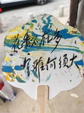 在活动中,制作漆扇这一手工最受民众欢迎,简单的白纸扇在表面浮着颜料的清水中轻轻转动,便留下了诸般色泽。奇思妙想在斑斓色彩与绘画手法的通力合作下,展现出渐变的深远意境。