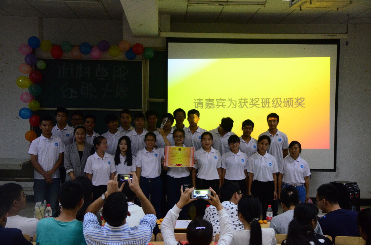 在工作人员分数完计算后,材料4班、5班、10班获得了本次比赛的精神文明班级称号,材料11班以93.85分获得了季军,材料10班以94,42分获得亚军。本次红歌大赛的冠军被材料5班以98.71分的高分揽入怀中。各位评委嘉宾在为获奖班级颁奖后合影留念。本次比赛也在大家的掌声中圆满落幕。