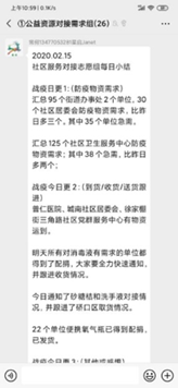 截至2月15日,所在志愿小组共计汇总95个街道办事处,30个社区居委会防疫物资需求,进行紧密对接,多家医院和社区已发来物资到位感谢信。