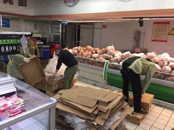 他的主要工作是进行爱心蔬菜包的分拣,各种肉类的切分、包装和配送。他说到,在超市工作的前几天感觉特别累,仅第一天下午就有近800份精瘦肉的订单,他被安排进行冻瘦肉切分的工作,每份5斤,不能多也不能少。