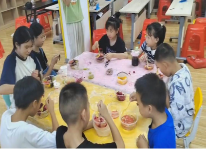 炎热的下午,清凉冰粉的制作品尝课让孩子们欢呼雀跃。在老师、志愿者的指导下,他们开始调配糖水、加入水果、果仁等配料,品尝着自己亲手制作的冰粉,那甜蜜的滋味让孩子们体会到了劳动所带来的快乐和成就感。