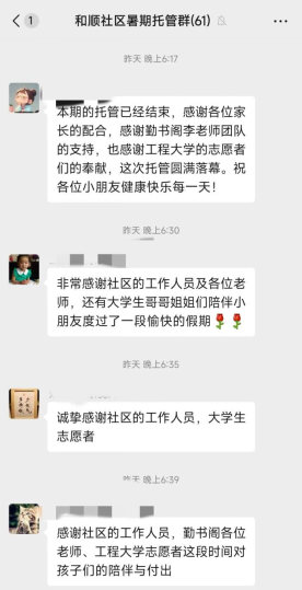 14名“小蓝钻”志愿者、8种特色课程、15天的陪伴,共同为28位社区小朋友带来了一个充满快乐和友谊的假期,同时有效缓解了社区职工家庭孩子看管的压力。他们在小朋友们进行日常作业辅导纠错的基础上,还开展了安全开班第一课、历史典故分享、心理互动游戏、冰粉制作体验等8种特色课程,深受孩子们欢迎,其中“做情绪的主人!”心理互动课程被长江网媒体报道,收到广泛好评。“小蓝钻”们深入社区、深入人心的志愿服务,不仅仅是知识的传授,情感的交流和心灵的成长,更是促使他们在学习中成长,在服务中增长社会责任感,在实践中增长才干,为构建和谐社区贡献自己的青春力量。