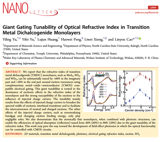 (通讯员 刘顺红)2017年5月15日,国际知名学术期刊Nano Letters(2015年影响因子13.779)在线发表了公司MK SPORTS熊礼威副教授与美国北卡州立大学合作完成的最新研究成果:Giant Gating Tunability of Optical Refractive Index in Transition Metal Dichalcogenide Monolayers。