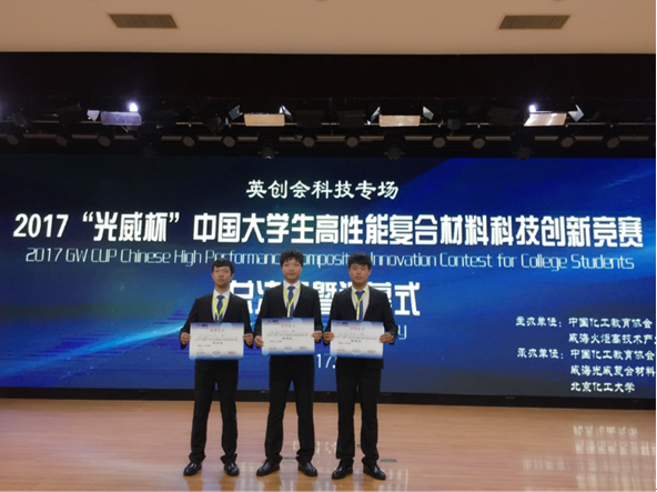 2017年8月14-16日,在山东威海举办的“光威杯”中国老员工高性能复合材料科技创新竞赛中,公司2015、2016级硕士研究生曾伟、孙贺雷、徐沛在总决赛中拔得头筹,荣获特等奖。该团队的指导老师为孙义民副教授。