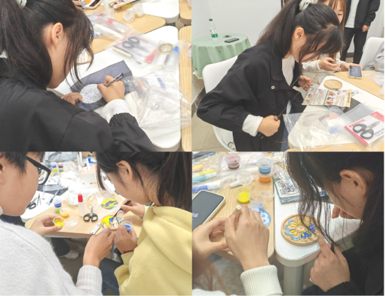 李芯蕊向同学们介绍了掐丝珐琅的历史和文化意义、基础制作步骤,重点讲解了掐丝、点蓝这两个关键步骤,她鼓励在场同学相互配合,一起完成制作。“金丝怎么捋直呀”“你这个图案好好看”“要不要少放点水,不然颜料颜色被稀释了”在欢快、轻松的氛围中,同学们自由发挥自己的创造力和想象力,通过艺术创作表达自我,同时充分沟通、交流,感受创意碰撞的快乐。