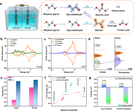 在这项工作中,作者利用理论计算和实验揭示了P在促进过渡金属磷化物表面重构方面的作用,这为引入生物模板策略合成双功能Fe2P-Co2P@Cmp预催化剂提供了有效指导。构筑的Fe2P-Co2P@Cmp催化剂在PET水解产物中表现出优异的EGOR//HER活性和稳定性,可以在工业级电流密度下稳定工作240小时。金属-载体的界面效应和介孔碳的限域效应加速了活性位点和载体之间的界面电子转移,有利于*OH和乙二醛的吸附,从而实现了FA的高选择性和EGOR的高催化活性。这项工作提出了构建高效PET回收升级催化剂的新策略,对生物学和清洁能源转化技术的可持续发展具有重要意义。