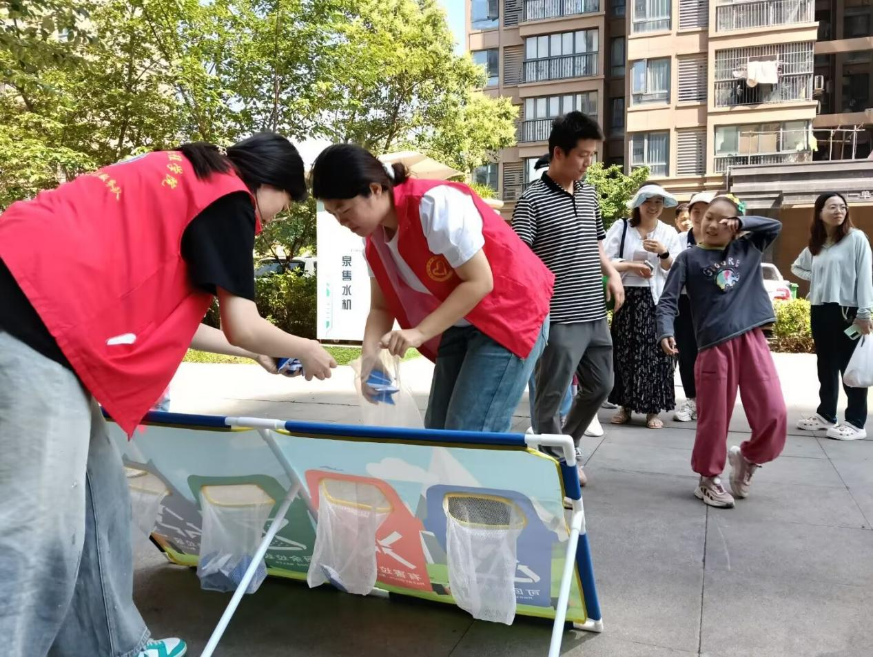 除了环保实践,现场还设置了丰富有趣的亲子互动环节。互动环节中,志愿者分工明确、配合默契。手工区志愿者指导孩子们制作母亲节贺卡,传递感恩之情;科普区志愿者通过有奖问答普及垃圾分类知识;游戏区志愿者组织投掷沙包等亲子游戏,现场气氛热烈。孩子们在游戏中学习环保知识,家长们也在互动中增强了环保意识。活动结束后,志愿者们主动承担起清理现场的工作,将场地恢复整洁,并把桌子等物品妥善归还社区。