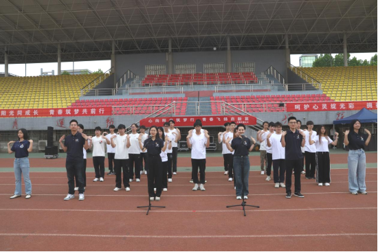 辅导员代表带领全场师生共同演绎心理健康手势操《拍拍操》。整齐的动作与欢快的节奏传递出青春活力,将现场氛围推向高潮。