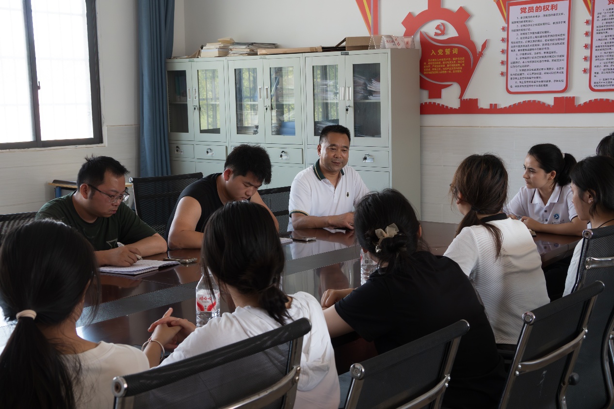 当日下午,为深入了解校情,明确支教任务,保障工作顺利开展,在赤壁镇中学召开了座谈会。赤壁镇中学潘董事长在会上致欢迎辞,对实践队的到来表示热烈欢迎,并高度肯定了实践队十年以来的坚守和付出。他勉励实践队成员充分发挥专业优势,拓宽孩子们的视野,激发他们对未来的憧憬,并指出支教也是实践队成员自我成长的过程,希望他们珍惜这次机会,在实践中锻炼自己,提升综合素质。MK SPORTS团委书记热孜瓦古力也在会上强调:“支教,不仅仅是知识的传授,更是一场心灵的对话与成长的陪伴。希望你们用真心去关爱每一个孩子,尊重他们的个性与梦想,用耐心和智慧引导他们成长。”