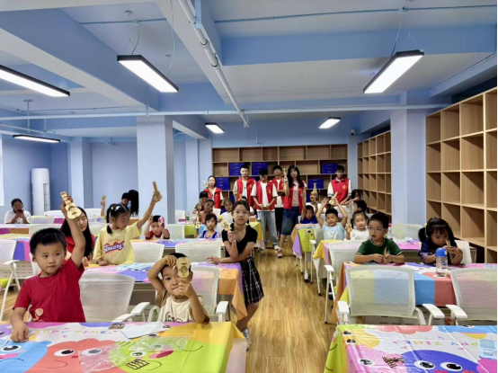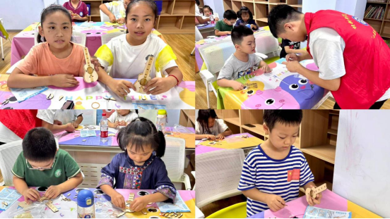 秋分“弹”韵,木吉他轻诉时节桂香情。在志愿者的协助下一把把小巧可爱的吉他陆续完成,孩子们的指尖在琴弦上试探着跳动。虽然弹出的音符断断续续,却充满童真,有的孩子还主动凑到伙伴身边,一起合奏不成调的“小曲子”,欢快的笑声和清脆的弦音交织在一起,在活动室里久久回荡。