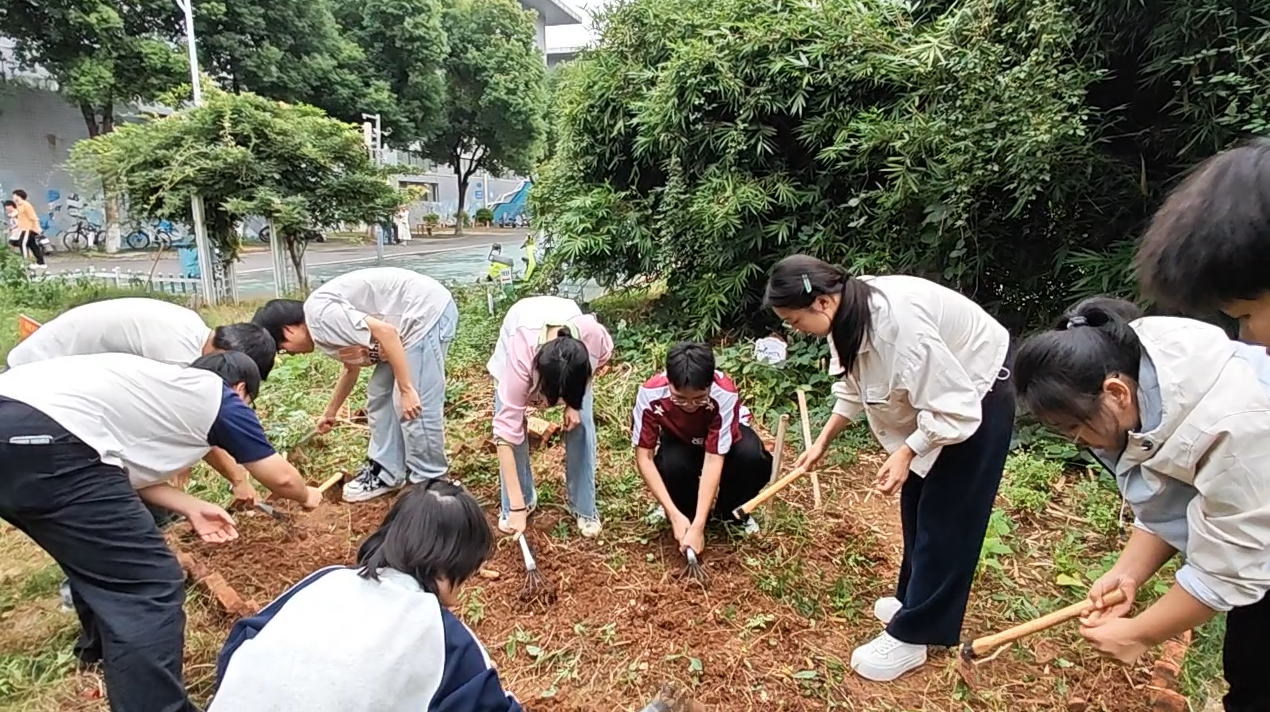 秋雨润而万物发,面对在作物的间隙中层层叠叠生长的杂草,大家各展所长,协作有序:有的同学手持锄头,对准杂草根部利落砍断;有的则挥动耙子,将散落的草叶快速归拢;有的同学直接俯下身,徒手拔出根浅苗细的杂草。汗水逐渐浸湿衣背,泥土也悄悄沾上了衣裤,尽管秋风带有凉意,但热情依旧未被吹灭。