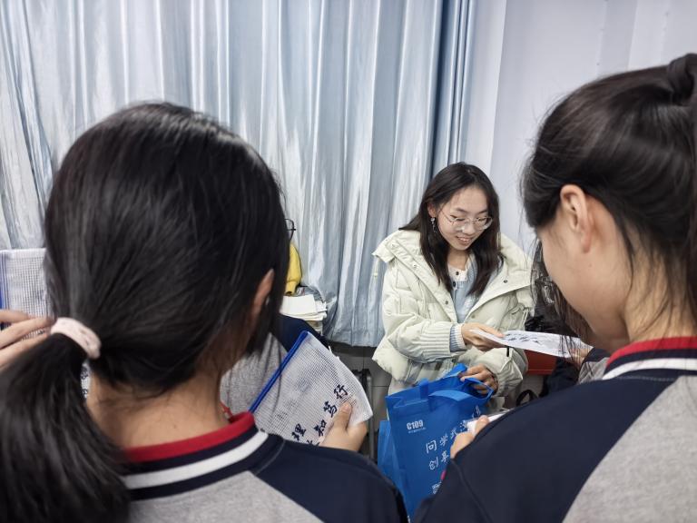 宣讲结束后,孙亦婷结合自身报考经历,为学弟学妹带来一系列实用且贴合实际的报考建议。她主动分享当年高考分数与全省位次,帮助学弟学妹更具体地了解高考情况;还针对院校与专业选择给出建议,提醒他们既要关注院校整体实力与办学特色,也要兼顾地域、就业前景,尤其需考虑自身适配度。此外,她分享大学感悟与收获,提供高三学习方法指导,还讲解了考场注意事项,并赠送学校小礼品,以鼓励与祝福激励学弟学妹为大学梦努力奋斗。