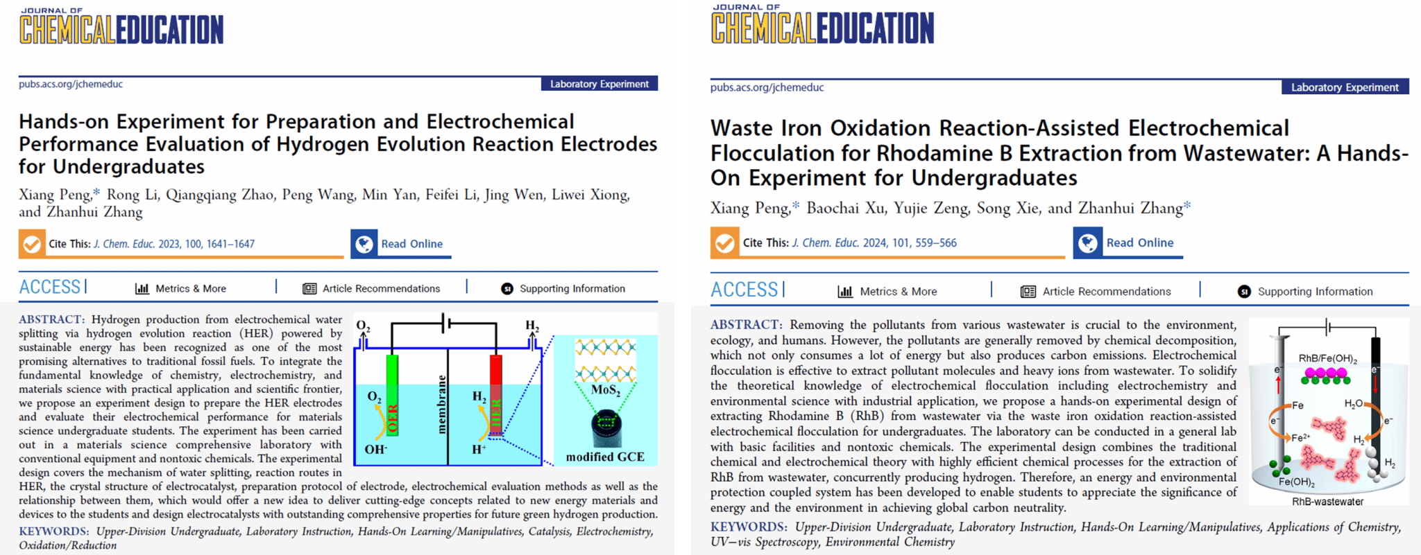 他以第一/通讯作者在化学教育领域国际著名期刊《Journal of Chemical Education》发表3篇教研论文——将析氢反应电极制备、废水染料电絮凝提取、稀土离子电化学提取等科研场景,转化为本科生实验项目。这些项目不仅让员工掌握了基本实验技能,更让他们在本科阶段就接触到真实的科研问题,培养了科学思维和创新能力。科研真正走进了课堂,赋能了教学。