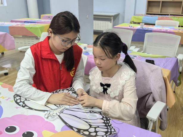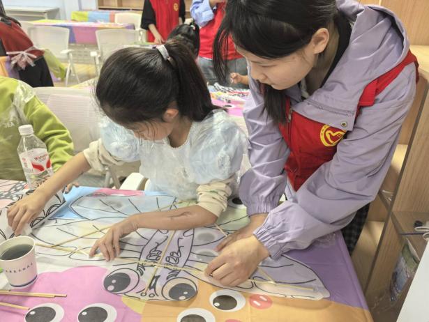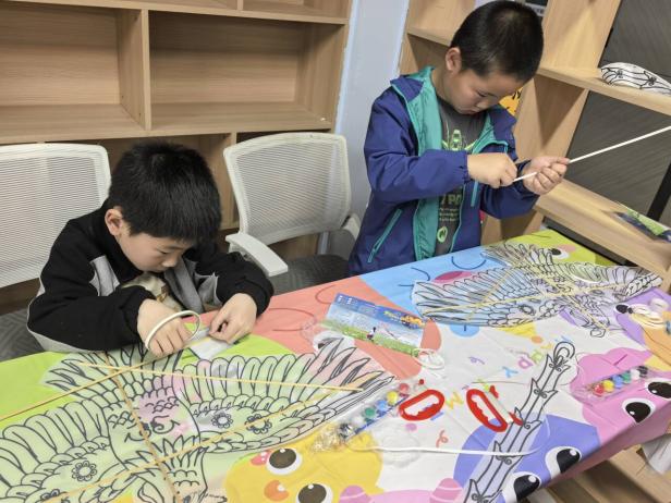 理论科普结束后,手工体验环节有序开展。为保障每位孩子都能深度参与,志愿者们采取一对一贴心陪伴模式,从风筝骨架搭建、风筝线固定到创意彩绘,每一个步骤都细致讲解、手把手示范。孩子们充分发挥想象力,用彩笔在素白纸鸢上勾勒创意,粉色蝴蝶、绿色蜻蜓、五彩老鹰等作品相继诞生,一只只纸鸢在稚嫩的画笔下变得色彩斑斓、独一无二,既锻炼了孩子们的专注力与创造力,更让他们在动手实践中真切触摸传统手工艺的温度。