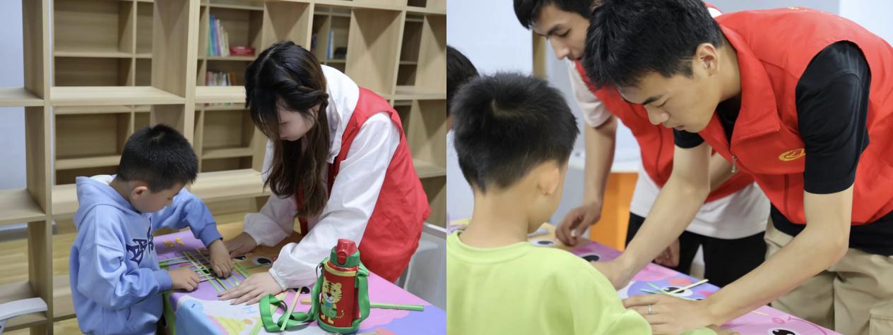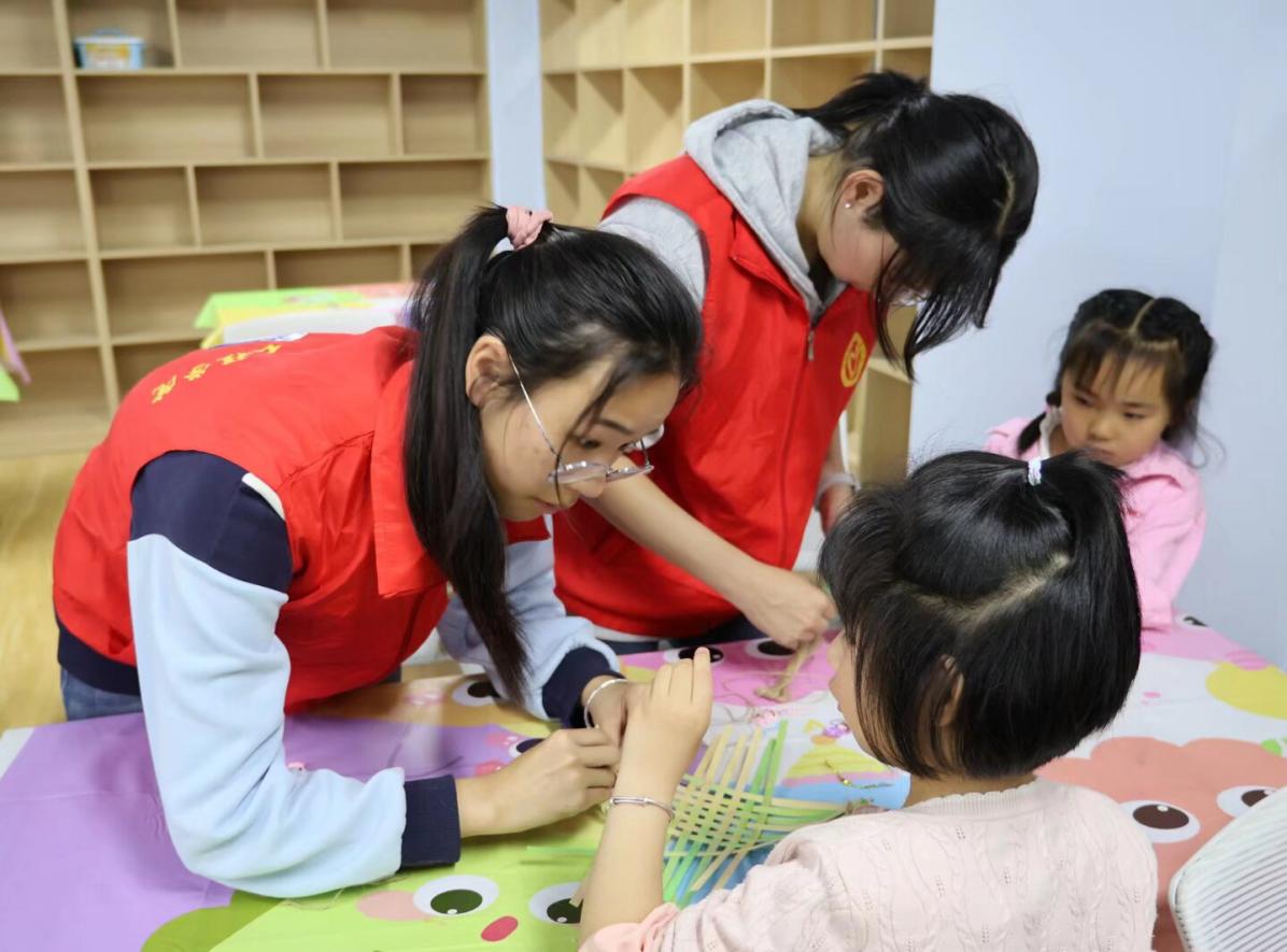 (志愿者一对一指导,孩子们沉浸式体验竹编与翻花技艺)