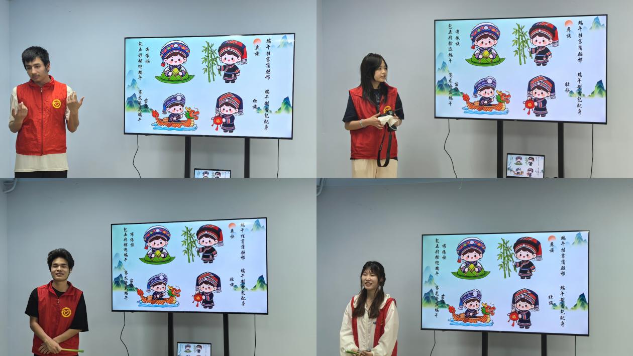 活动伊始,来自汉族、土家族、维吾尔族等多个民族的“小蓝钻”志愿者先用家乡方言向小朋友们问好:“大家好,我是你们的阿达西!”“小朋友们,我们一起耍嘛!”一声声质朴的问候瞬间拉近了和孩子们的距离。志愿者们分享了各民族的风俗习惯与节庆故事,还带领全场唱起民族山歌,小朋友们跟着一起学唱,现场气氛热烈又温馨。随后,志愿者拿出提前准备好的竹编小船与翻花小龙样品,为孩子们讲述龙舟文化中同舟共济的团结精神,孩子们听得格外入神,频频点头,现场其乐融融。