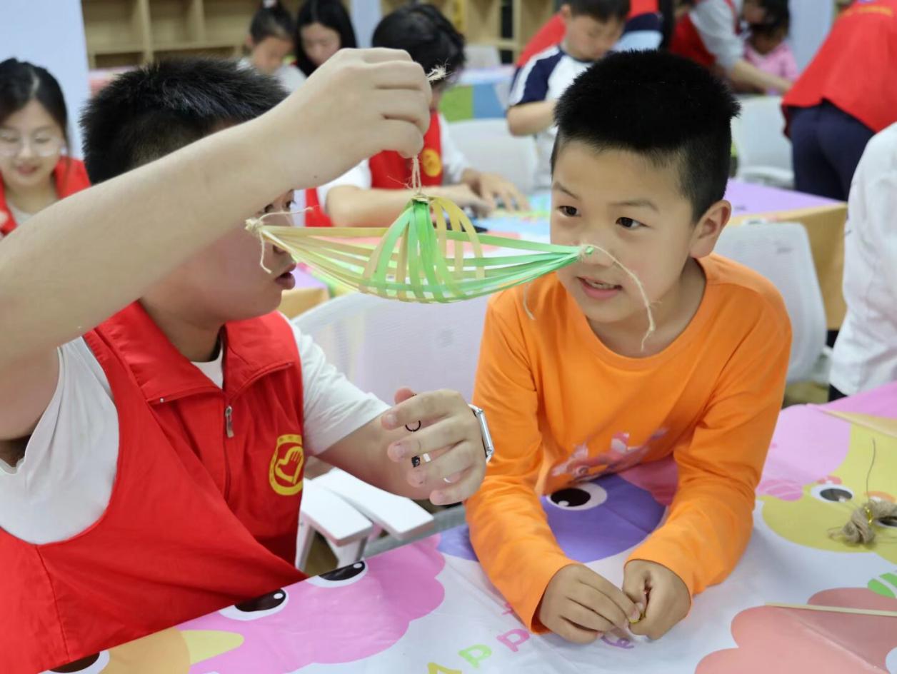 “你看你看!这是我的翻花,我给它起名叫小彩龙!”一位小朋友高高举起自己的作品,兴奋地跑到志愿者身边,眼睛笑弯成了月牙。不一会儿,教室里满是举着竹编小船和龙头翻花奔跑的小小身影,孩子们三五成群展示着自己的得意之作,欢笑声此起彼伏。