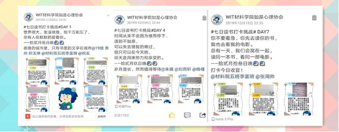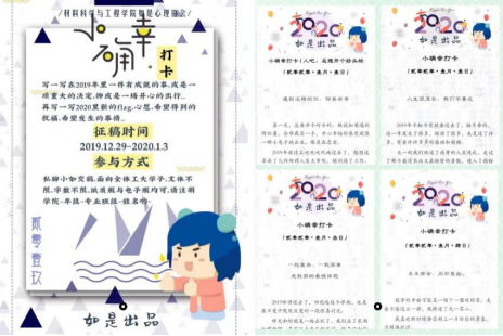 2019年12月29日-2020年1月3日,开展了“小确幸· 新年打卡”活动。参与者用文字的形式分享2019年的成长和收获,以及对2020年的规划和期待。优秀作品在官方QQ上进行展示,以传达积极乐观的精神,提倡总结思考的习惯。