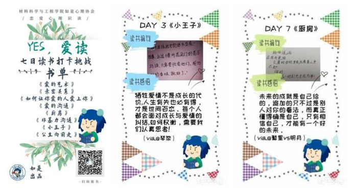 12月5日-12月13日,组织“Yes,爱读”七天恋爱读书打卡活动,涉及与恋爱有关的《亲密关系》《爱的艺术》《厨房》《小王子》《非暴力沟通》《公主向前走》《如何让他爱上你》七本书。参与者在书单中任意选择一本书,每天阅读一定的页数,并进行读书笔记和思考的打卡分享。组织者每天精选笔记和思考在官Q上进行推送。此次读书打卡活动旨在倡导大家多读书和多思考,在书中寻找生活困扰的答案,学会更好地认识恋爱和经营恋爱。